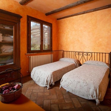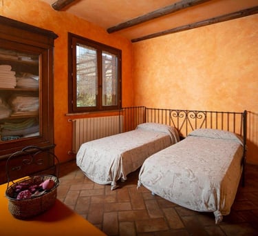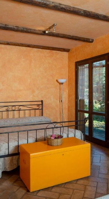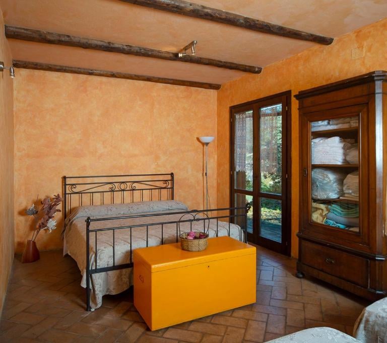 Ampia camera con un letto matrimoniale e due letti singoli, vista sul giardino, ideale per famiglie e gruppi, offre un ambiente accogliente e rilassante, perfetto per trascorrere momenti indimenticabili. Gli ospiti possono godere di spazi aggiuntivi per il relax e la socializzazione.